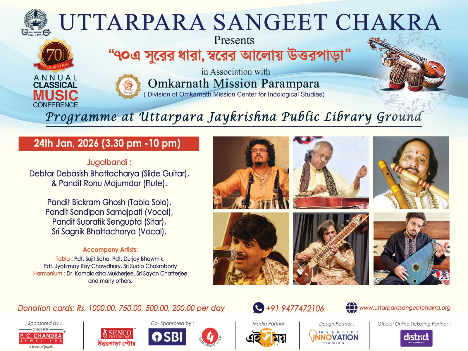 U ttarpara Sangeet Chakra is a voluntary social and cultural organisation operating from its office cum Training School premises in Uttarpara. The organisation is widely known for its Annual Classical Musical Conference. It also organizess local and district level Conferences, workshop, talent search competitions throughout the year.